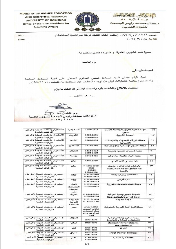 في التسلسل رقم 28 ظهرت مجلة بحوث العلمية الدولية المحكمة رقم تسجيل دولي 2313- 1004 ضمن الدوريات العلمية المحكمة التي أقرتها وزارة التعليم العالي في العراق ممثلة بجامعة بغداد للترقيات العلمية ” الاستمرار باعتماد المجلة لأغراض الترقيات العلمية ” . وصرح مدير تحرير المجلة د. محمد عبد العزيز أن إدارة مركز لندن للبحوث والاستشارات الجهة المصدرة للمجلة قد تلقت كتابا من رئاسة جامعة بغداد يشير إلى قائمة من المجلات المعتمدة
